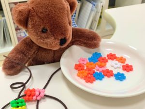 さいごに、大好きな花はじきをつなげてかわいいネックレス作り。